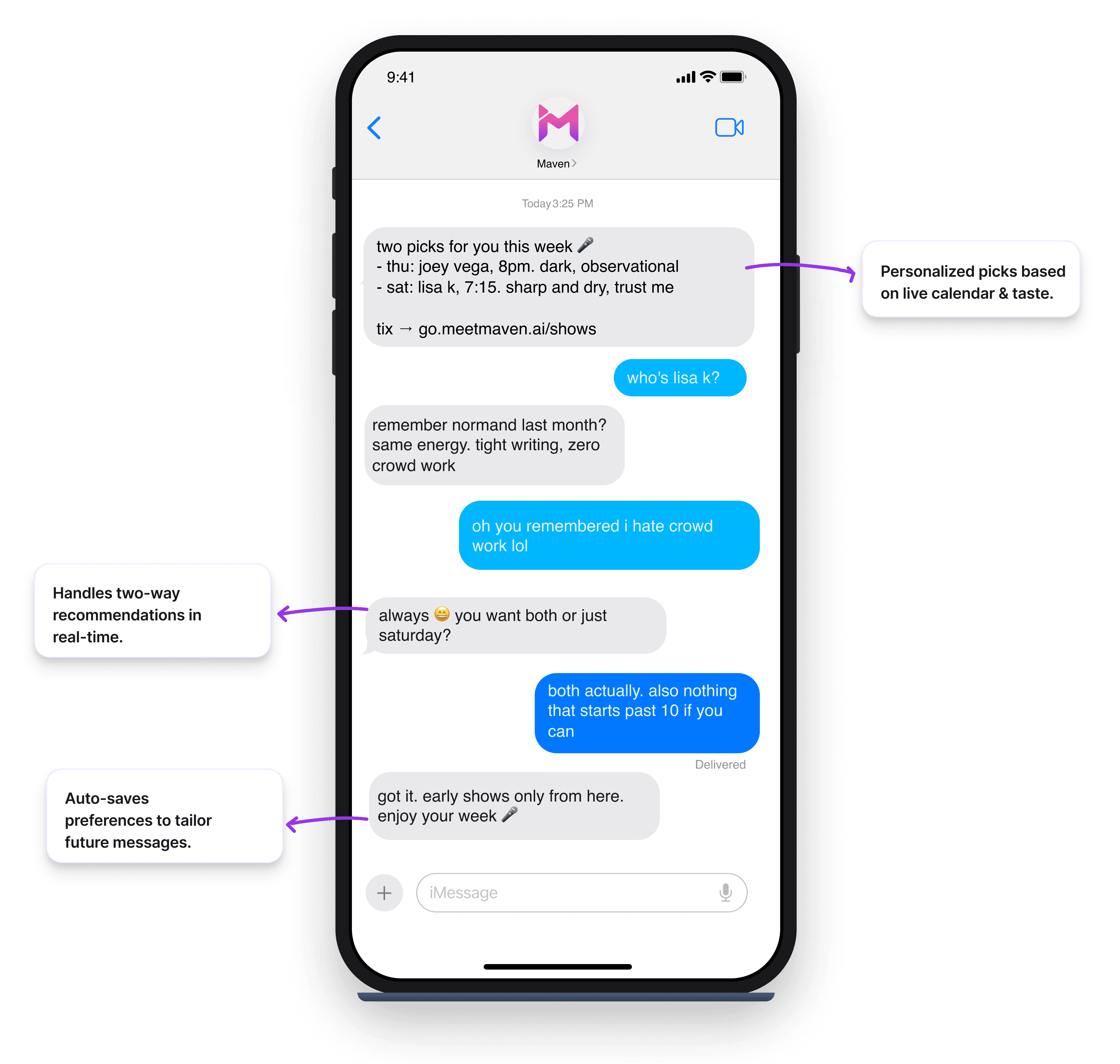 Maven learns your calendar, learns what each fan likes, and only texts when something fits.